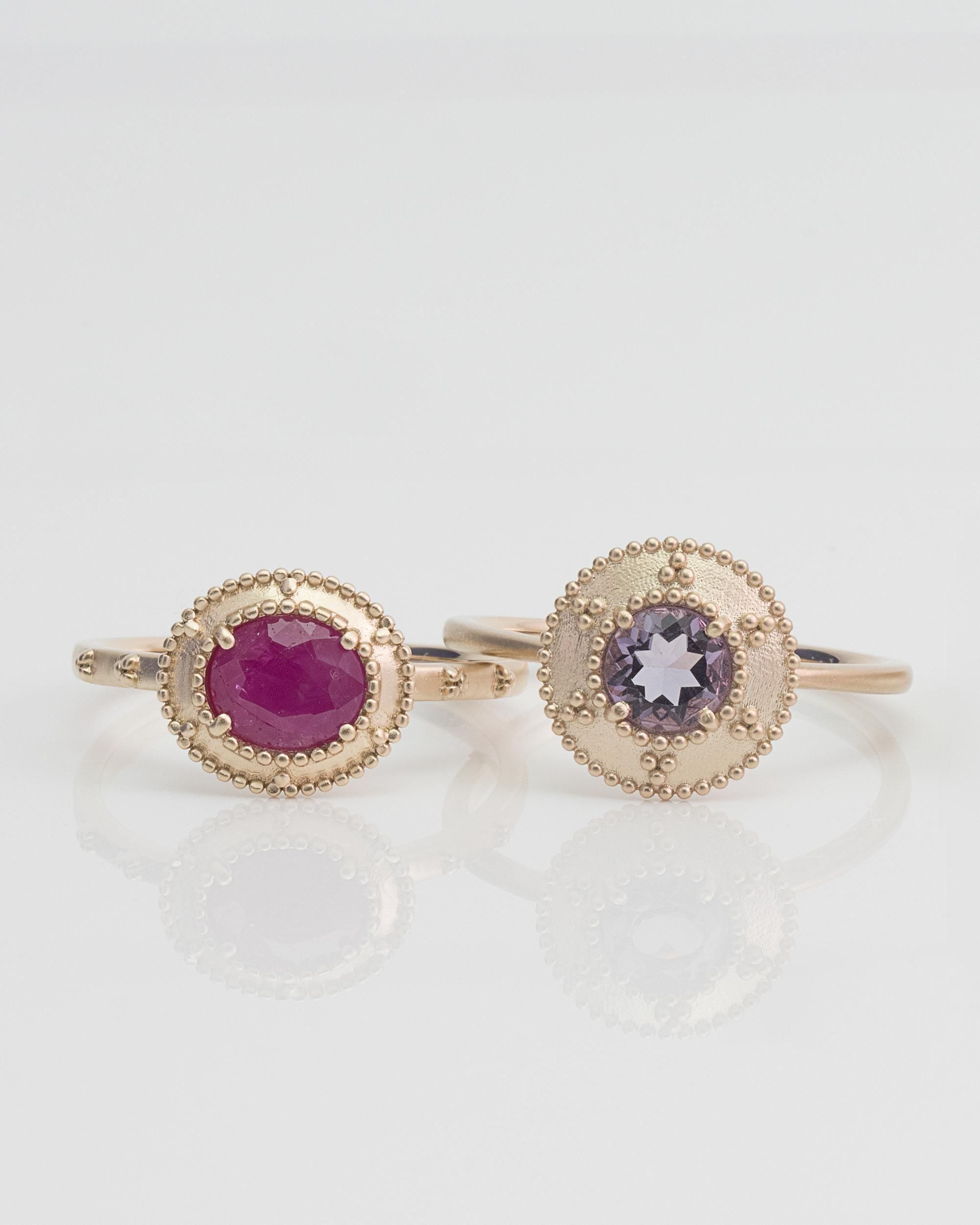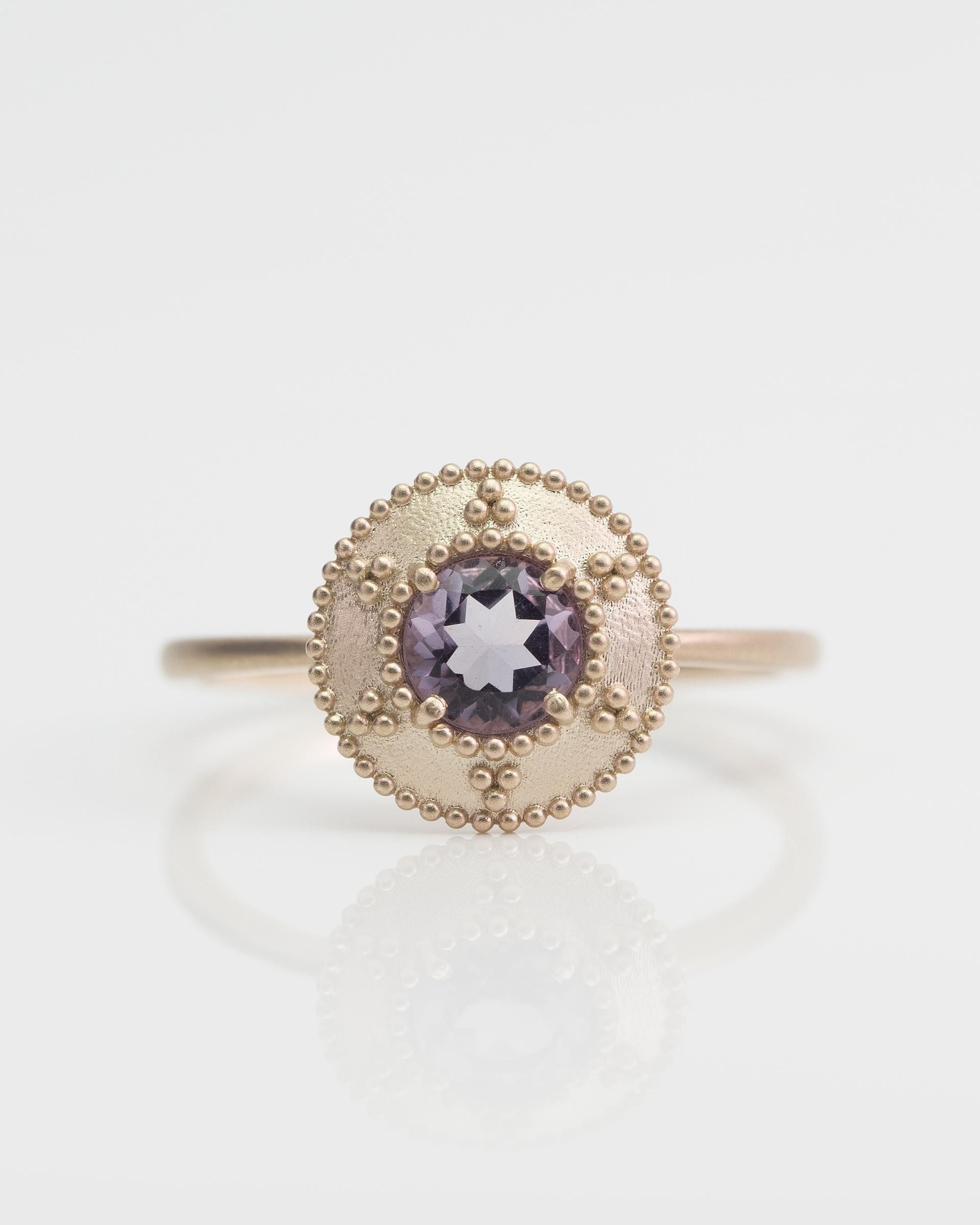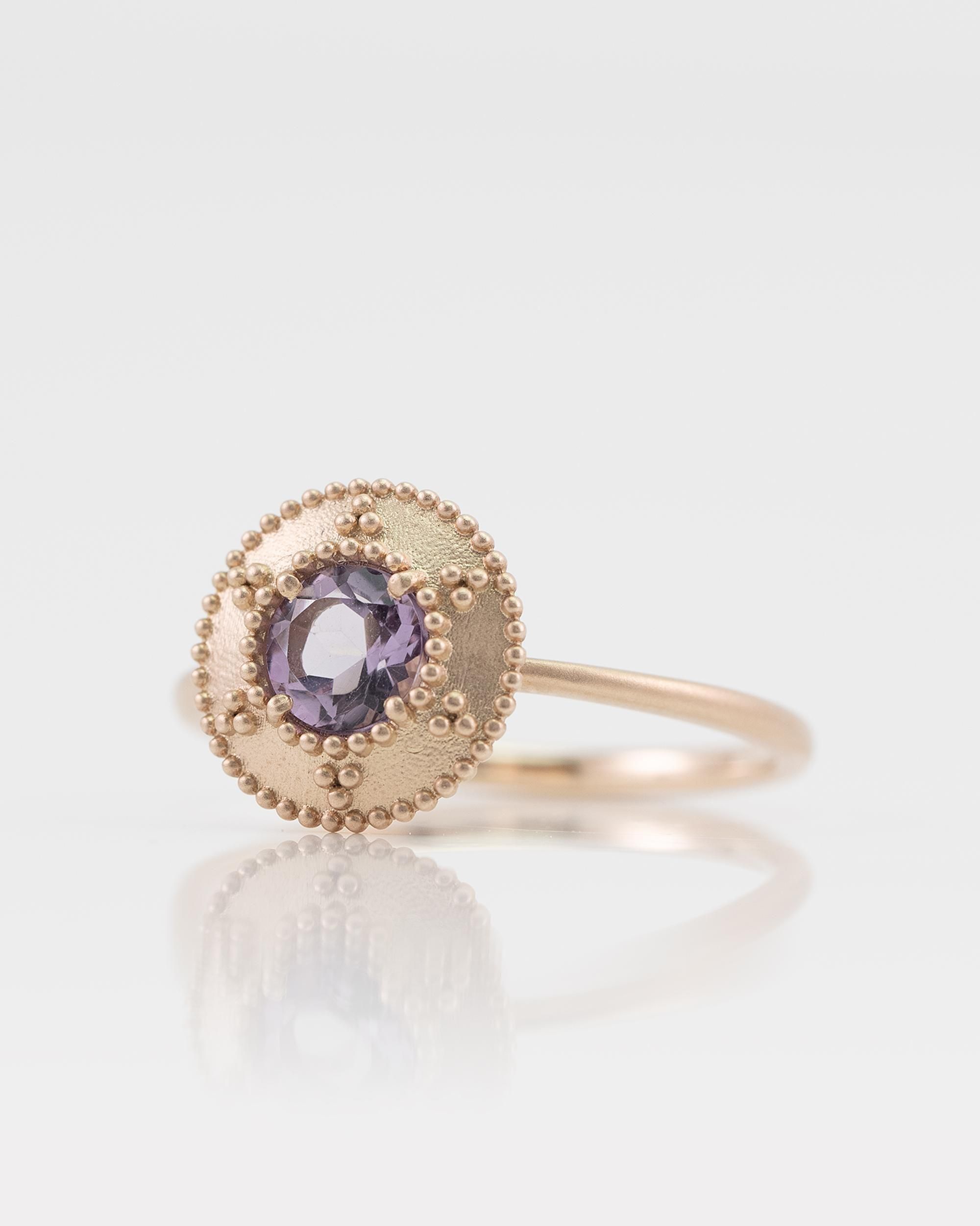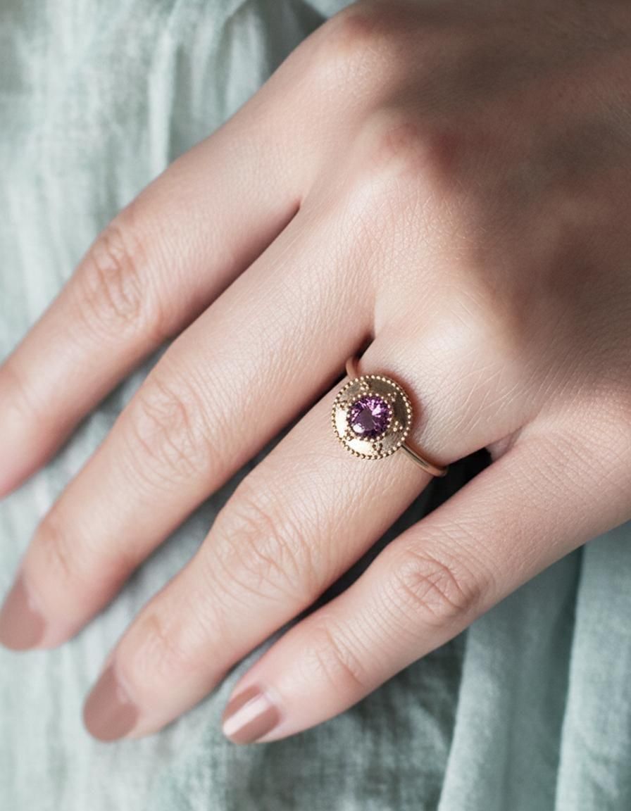 古代の装飾技法「粒金(りゅうきん)細工」にインスピレーションを得て、天然石の形に合わせて粒のレイアウトを一点ずつデザインしたソリティアリングです。
